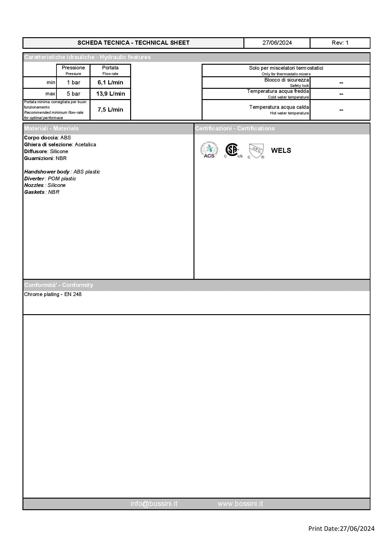 Corpo doccia: ABS - Ghiera di selezione: Acetalica - Diffusore: Silicone -Guarnizioni: NBRH