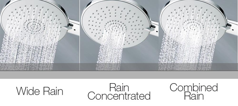 Docce Mixa/3 autopulenti dotate del sistema Fitair e con tre tipi di getto (Wide Rain, Rain concentrated, Combined Rain). Potete scegliere tra due dimensioni Ø 140 e Ø 110 mm.